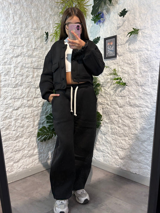 Completo nero in tuta con giacca college e pantalone palazzo - FELPATO 4-14 anni