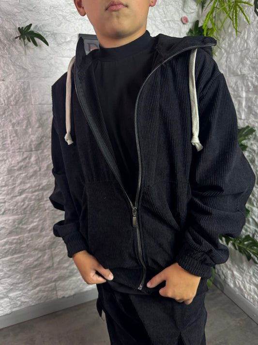 Completo nero a millerighe con felpa zip e pantalone cargo 8-16 anni