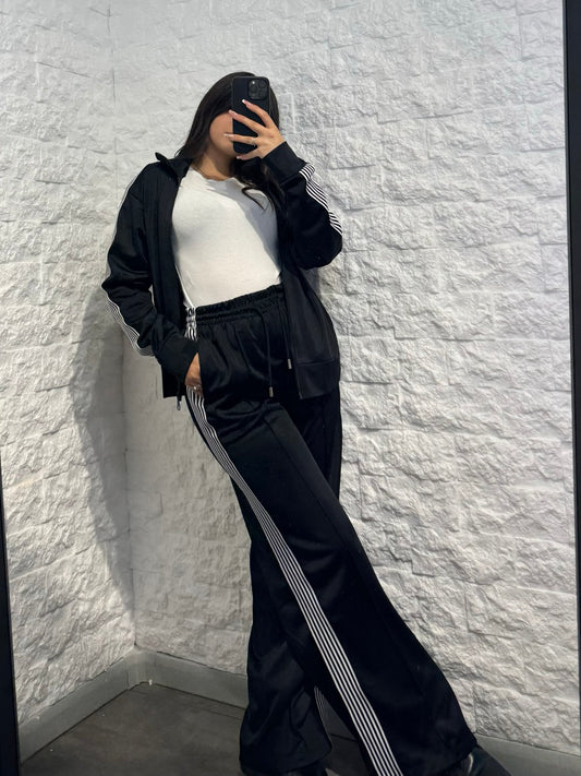Completo nero in tuta con giacca e pantalone a palazzo con bande bianche