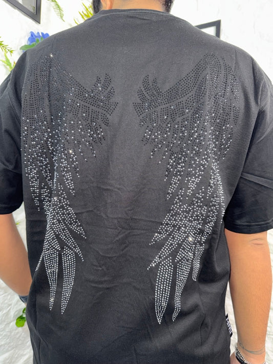 T-shirt nera con stampa ali e scritta "ANGEL" - OVERSIZE