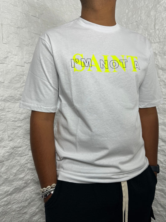 T-shirt bianca con scritta "I'M NOT A SAINT" in giallo fluo