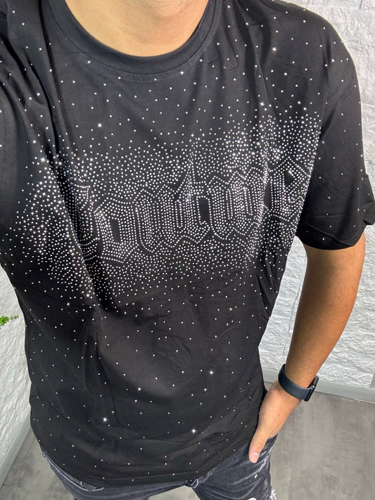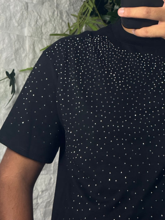 T-shirt nera in tinta unita con mezzo collo alto e brillantini