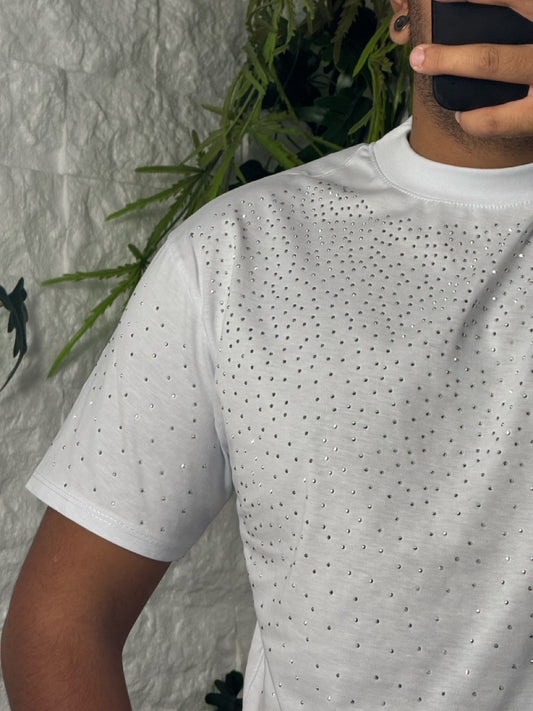 T-shirt bianca in tinta unita con mezzo collo alto e brillantini