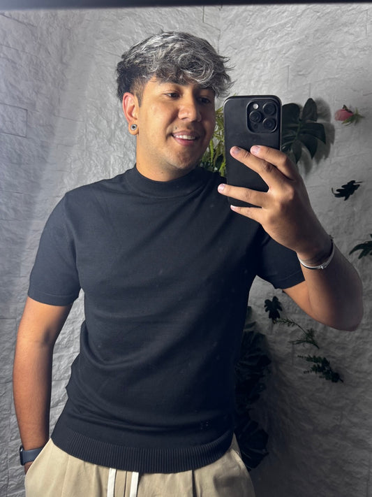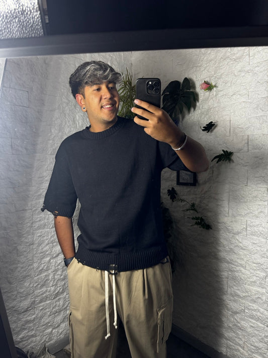 Polo nera in maglia a manica corta con bordo bianco e dettagli destroyed