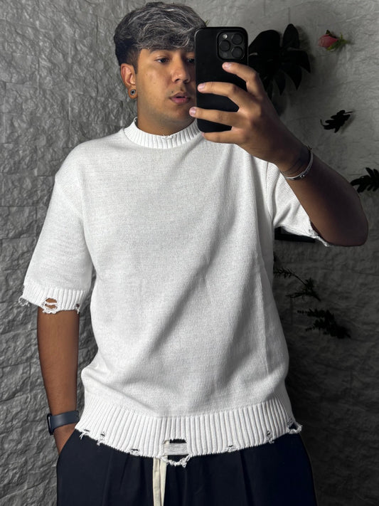 T-shirt bianca in maglia a manica corta con effetto destroyed