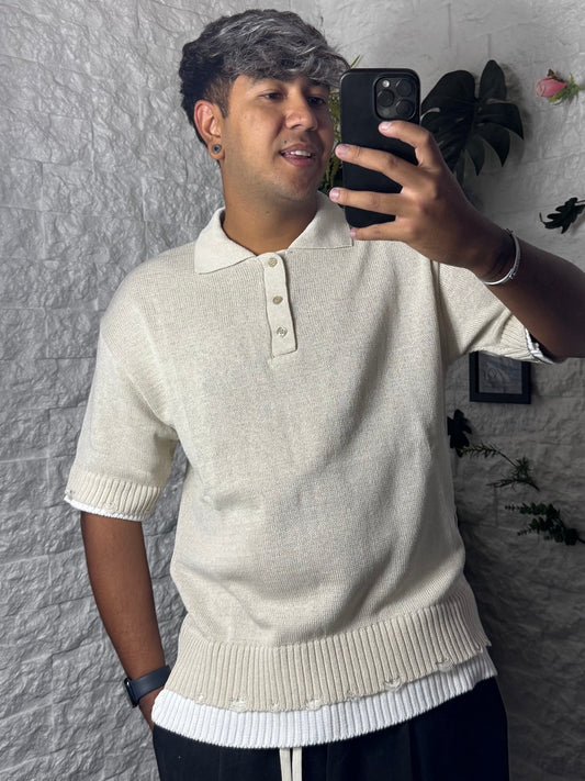 Polo beige in maglia a manica corta con doppio bordo e dettagli destroyed