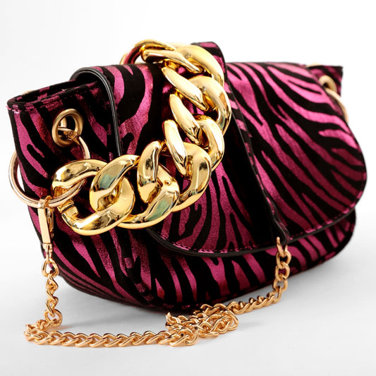 Borsa zebrata laminata con catena dorata