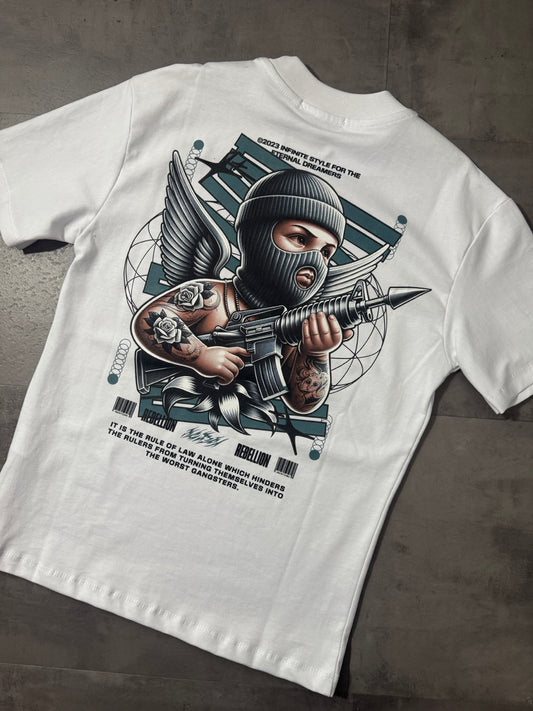 T-shirt bianca con stampa "REBELLION" e grafica urban - OVERSIZE 10-16 anni
