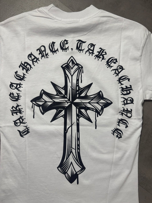 T-shirt bianca con stampa "TAKE A CHANCE" e croce - OVERSIZE 10-16 anni