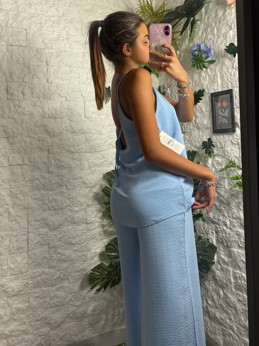 Coordinato celeste in simil lino con canotta e pantaloni palazzo