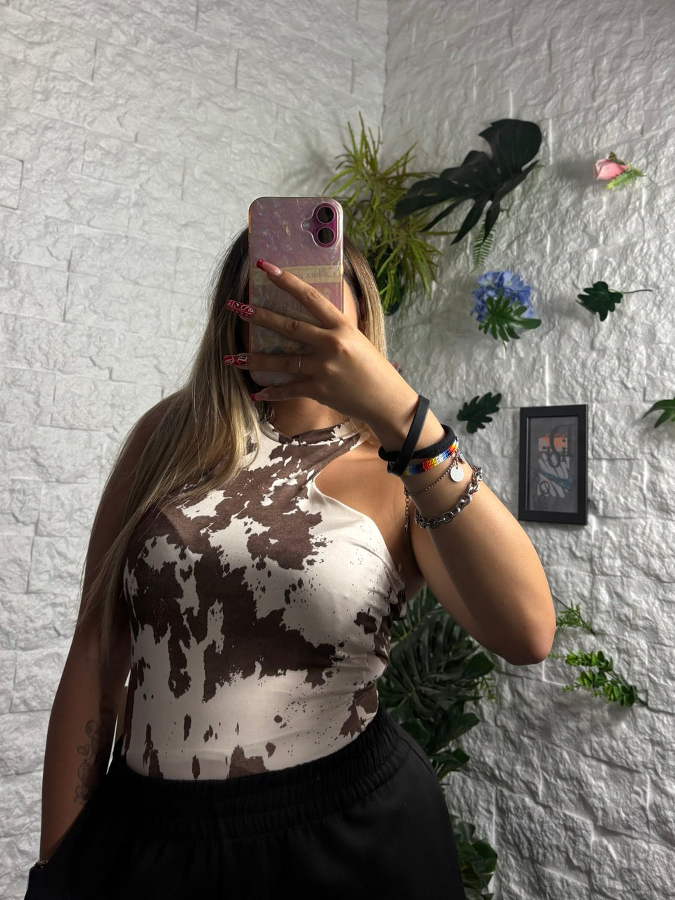 Body smanicato con stampa maculata marrone e scollo con apertura laterale
